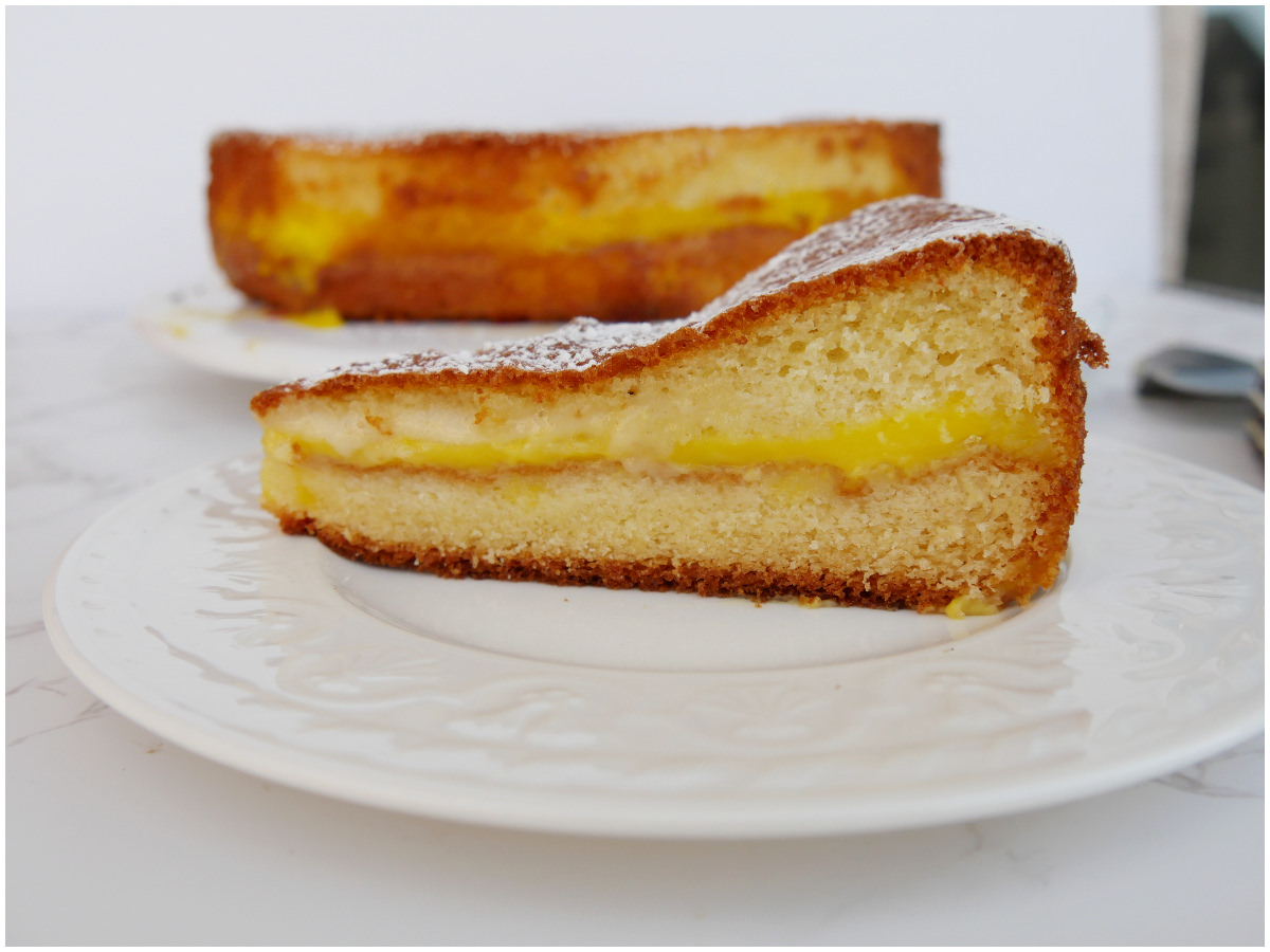 Torta con crema al limone. La torta con crema al limone è un dolce soffice a cui in cottura viene aggiunta la crema, perfetto per la colazione o la merenda di grandi e piccini!